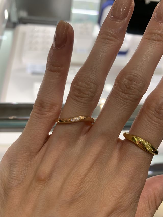 繊細なデザインで、ダイヤの部分もきらっと目立ちすぎないのが良かったです。細い指の私にはウェーブは違和感があり断念しました。