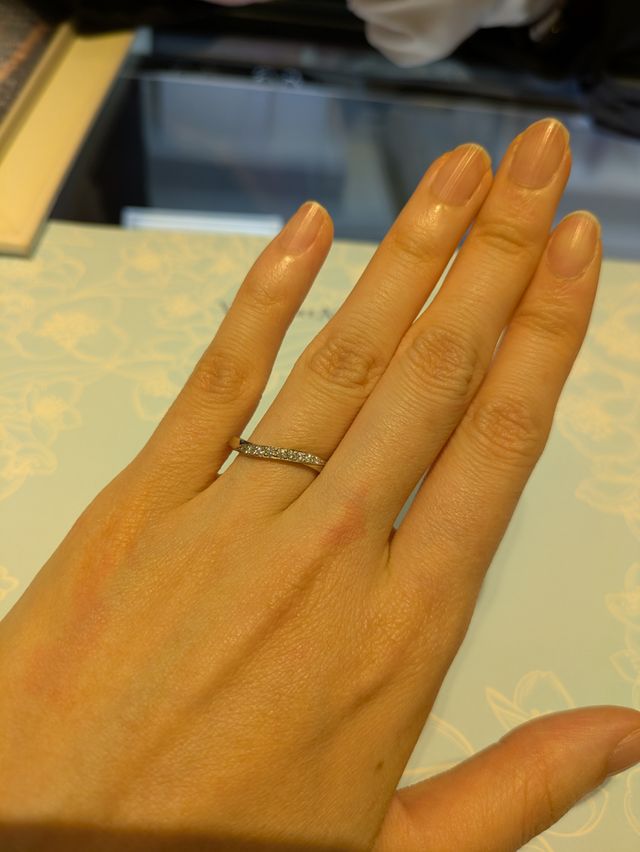 細身で石ありを探していて、ウェーブの指輪を案内いただきました。おしゃれなデザインがたくさんあり、上品な指輪でした。ダイヤは大きめでキラキラしていますが、上品な感じで長くつかえそうな指輪でした。石もしっかりついていました。