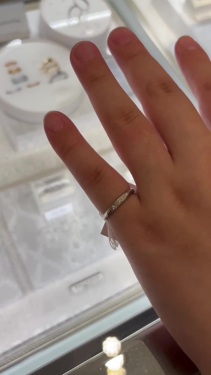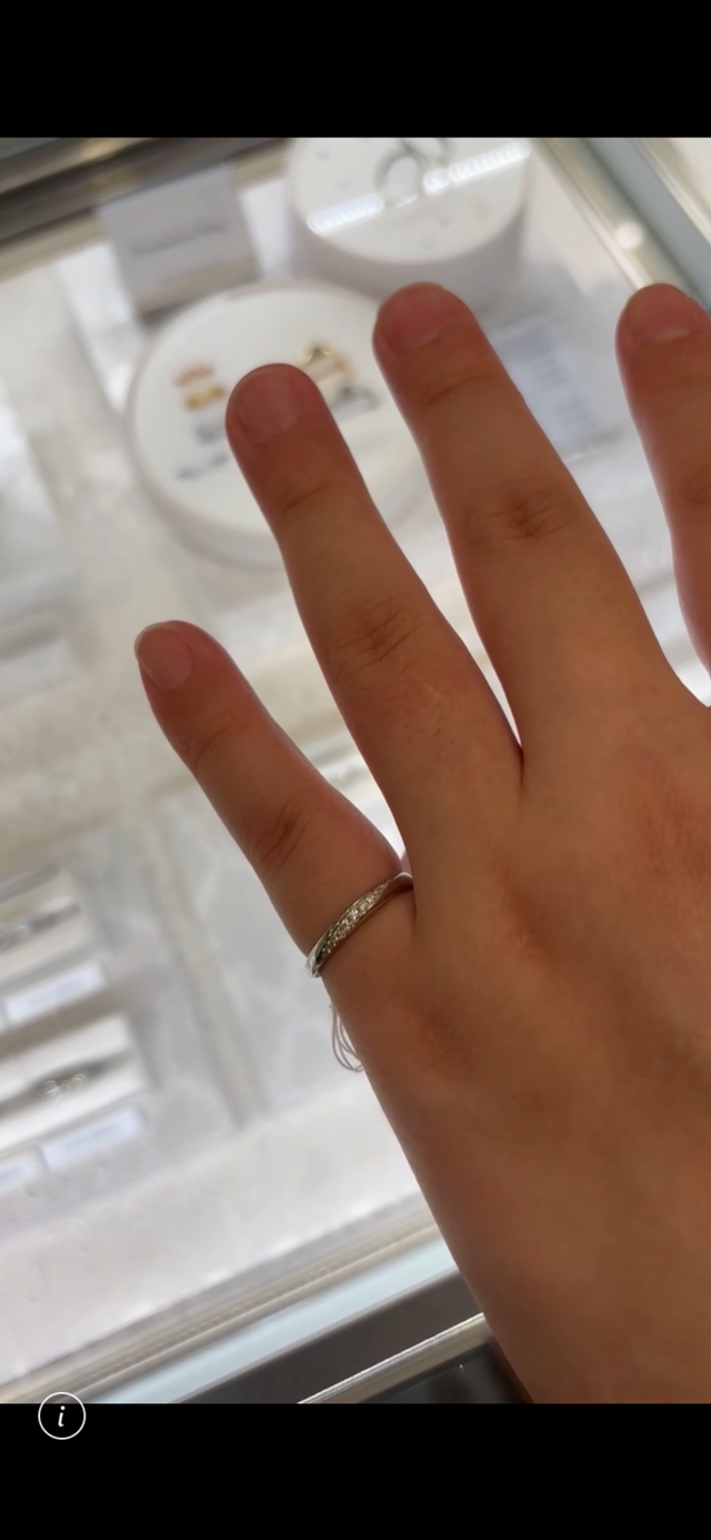 ゴージャスな感じがして普段から使うので見た時にテンションがあがるなと感じました。ただ、彼はペアデザインが付けたいと言っていたのでそうなると男性物は少し違うかなと感じましました。でもたくさんの指輪をはめて決めたかったので試着できて良かったです。
