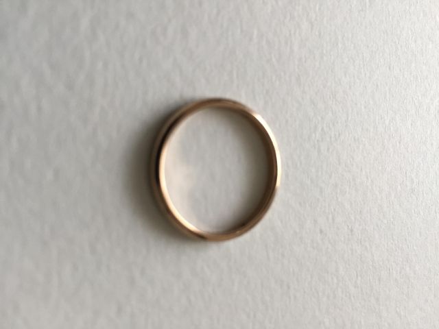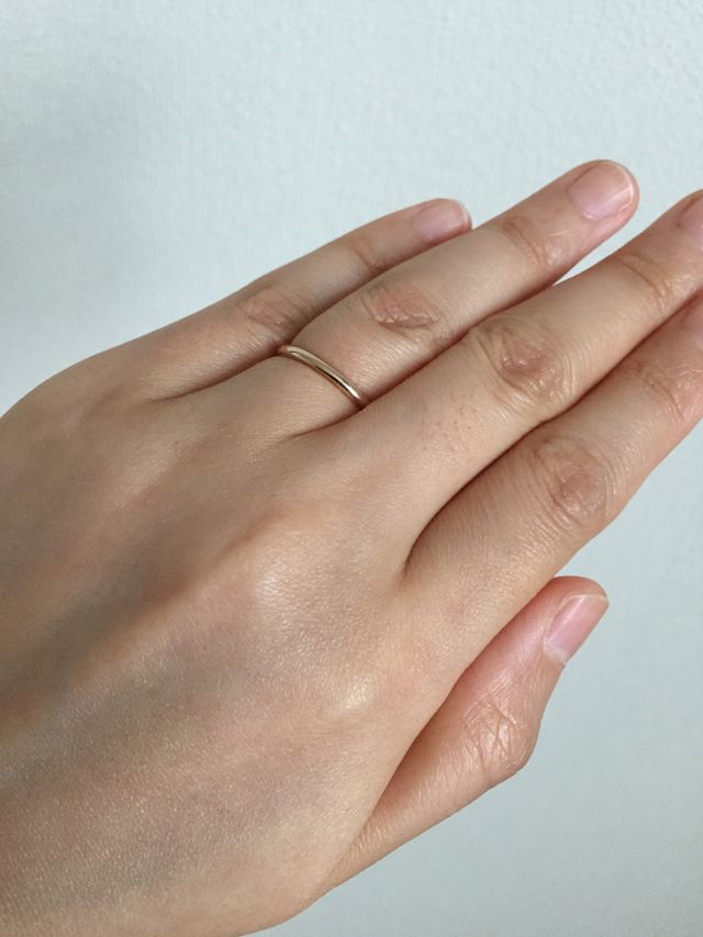 余分な装飾が一切なく、ひたすらシンプルなデザインであるというところが一番の決め手。また違和感なく着けられる細さと程よい丸み、軽さも文句なし。箱にしまわず常に身につけている場合には、着用感は大事です。肌なじみを考えて選んだピンクゴールドの色味も主張し過ぎず気に入っています。