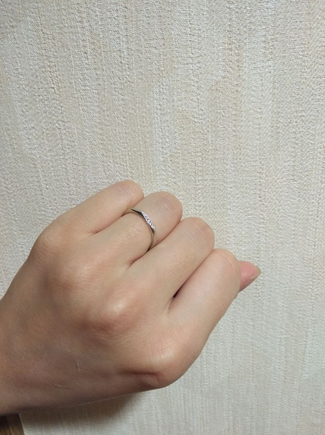 シンプルなものを探していました。どこのお店もシンプルなものはたくさんあるためどうしようか悩んでいたところ、ふらっと見つけて試着してみたらしっくりときたため購入しました。石が少し入っています。悪目立ちせず細めなところが気に入っています