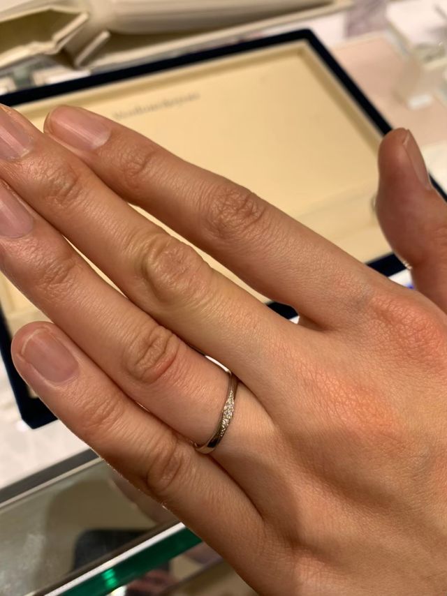 夫はマット加工のされた指輪が、いい意味でキラキラ感が無い手に馴染むデザインで気に入り、妻は控えめなダイヤが入った指輪のキラキラ感が気に入りました。