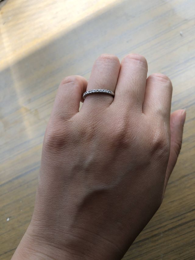 ダイヤモンド×ホワイトゴールド素材のハーフエタニティタイプのマリッジリングを探していたところ、こちらのリングに決めました。他にもティファニーやカルティエ、ヴァンクリフアーペル、ポンテベッキオ、4℃など複数のブランドのリングとも比較検討してみましたが、リングの価格や付け心地、ブランドの信頼感、店舗の雰囲気や店舗スタッフさんのサービスの良さなど総合的に判断して最終的にこのリングに決めました。購入してから数年が経過していますが、今のところ経年劣化や傷などもほとんど感じないです。サイズ調整もすぐに対応していただけるとのことで安心して購入しました。ホワイトゴールドですがプラチナよりも価値が上昇しているのでゴールドにしてよかったです。