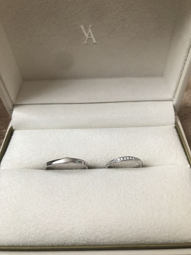 夫がよくプレゼントしてくれたアクセサリーが、ヴァンドーム青山さんのものだったので、結婚指輪もそこで買おうとずっと決めていました。ダイヤの華やかさと指に馴染むカーブのデザインが一番の決め手です。また、ダイヤの表面が滑らかで家事の時に汚れにくいと教えてもらい、とても気に入りました。夫のリングは真ん中がマット仕上げのストレートのデザインにしました。形やデザインが私のものと若干違いますが、「いろんな組合せでペアにできますよ」と店員さんに言われたことで安心してお互いに好きなものを選べました。