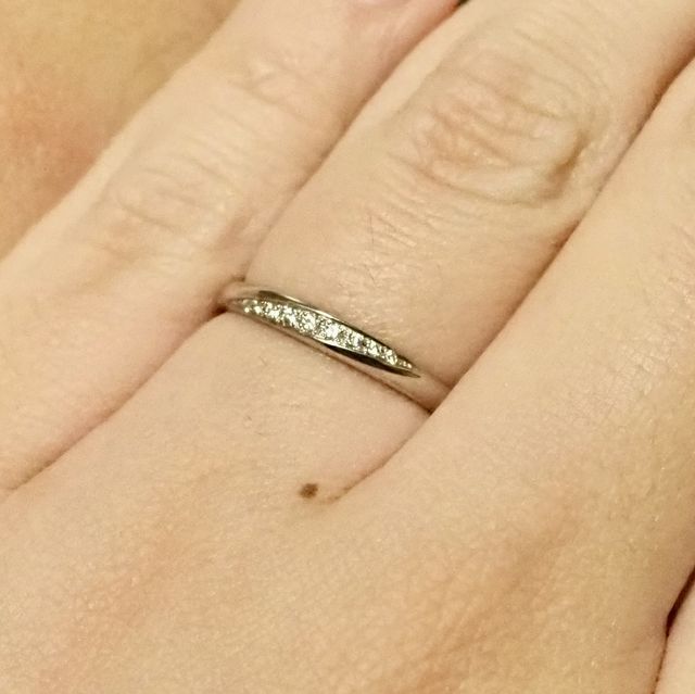 正直なところ、それほど珍しいデザインではないかもしれませんが、夫のものとお揃いのデザインにしたかったこともありこちらにしました。男性用のマットラインも素敵です。ダイヤはH&Cでとてもキラキラと綺麗です(^^)
