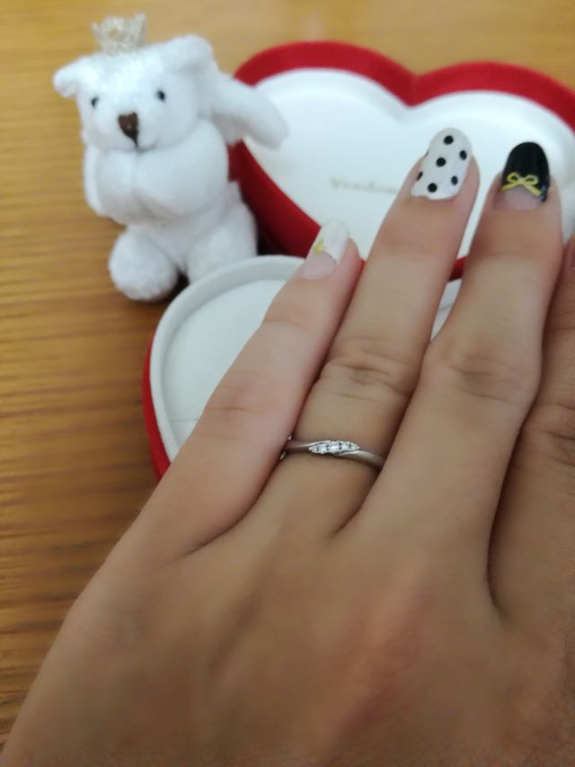 婚約指輪と同じブランド(海外ブランド)にしようかと思っていましたが、挙式等費用がかかることもあり費用を抑えたいと銀座三越内を見てまわりました。日本のブランドにしたいと決めた中でかわいらしいデザインのものが多くこのブランドでと決めました。