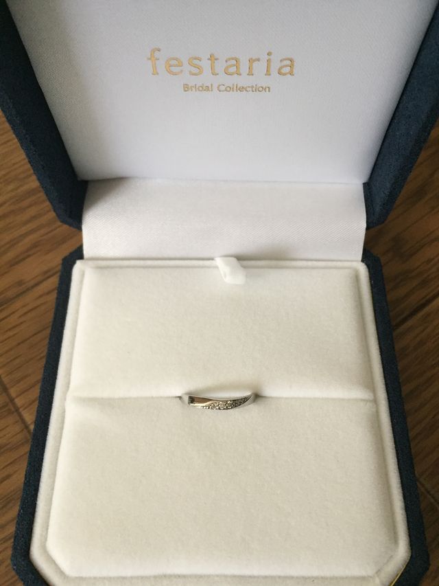色々と試着しましたがデザインが1番気に入りました。少しカーブしていてダイヤモンドがついており光具合が素敵だなぁと思いました。中の刻印を無料でしてくれるとこも魅力的で日付とイニシャルと誕生石も入れてもらいました。