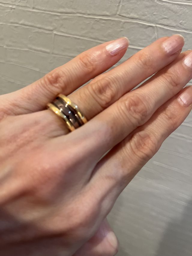 シンプルでどんなスタイルにも合わせやすいです。夫は小指に、私は左手の薬指にはめています。普段使いにも、ちょっとしたおでかけデートにも、いつも一緒に楽しんでいます。少しデザインが入っているのもおすすめです。