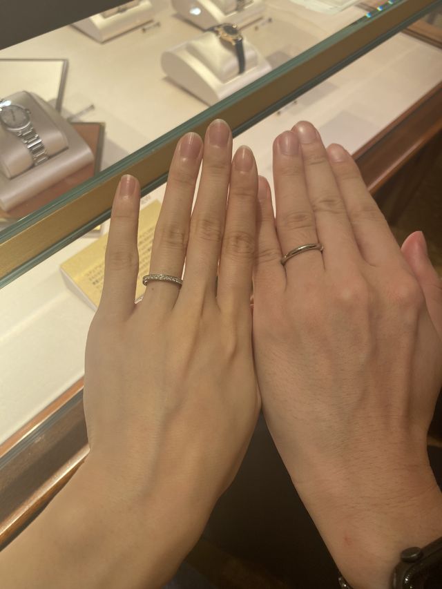婚約指輪がブルガリだったので、結婚指輪も同じブランドで見てみました。ダイヤモンドがキラキラ輝いている感じが1番でした。ただ比較的しっかり太さがあるものだったので私の指には大きく見えてしまい購入には至りませんでした。