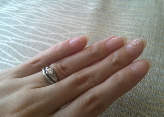側面のカーブにピタリと寄り添う婚約指輪とセットでつけることができるのが一番のポイントでした。