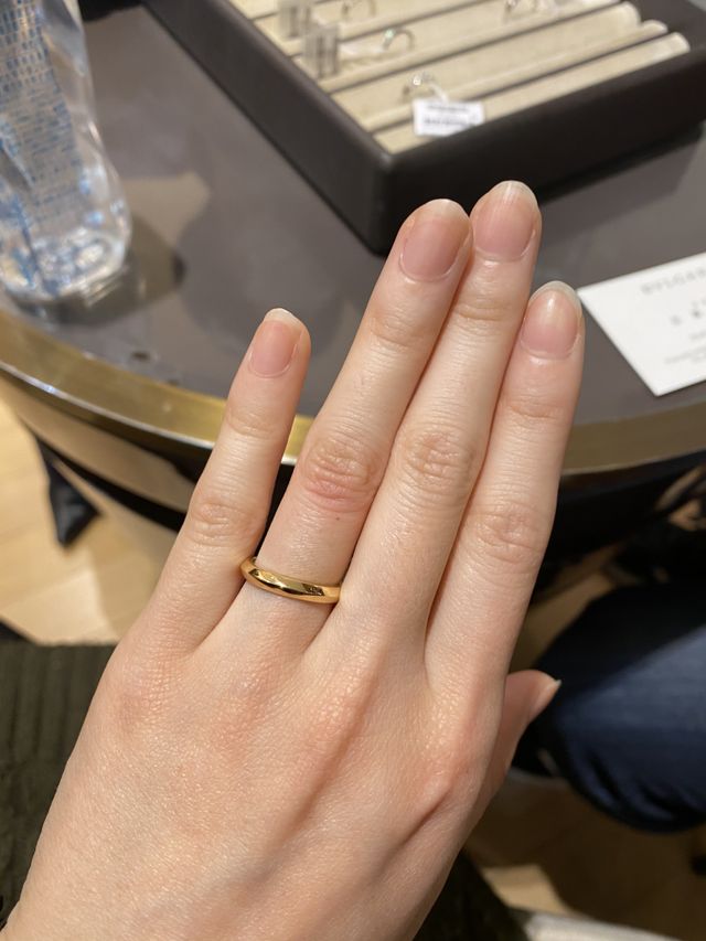 あまり人と被らないデザインの指輪が良いなと思って探してました。ゴールドで肌馴染みが良く真ん中にカットが入っているのでシャープな印象の指輪でした。細めのデザインなのでゴールドですが悪目立ちすることもなかったです。