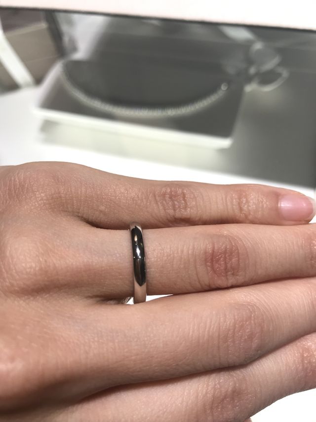 スッキリとしていてシンプルな指輪になります。最近は女性の結婚指輪はダイヤ入りが主流で、なかなかダイヤが入っていない指輪はありません。その中でこちらではシンプルな指輪だった為試着しました。重さはわりとずっしりしていました。