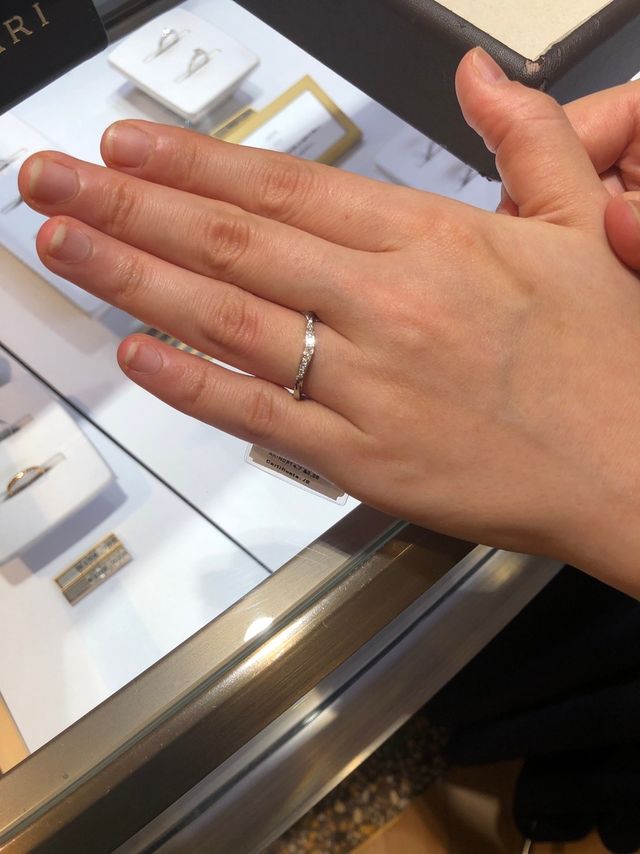 ウェーブがかかったデザインで、つなぎの部分のあえてゴツゴツさせたかんじの加工が特徴的でした。これはブルガリの職人技だそうです。こちらの指輪は色は一色のみだそうで、希望してたピンクゴールドのものはなかったです。