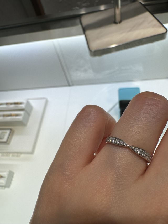 婚約指輪をティファニーにしたので、結婚指輪もティファニーを検討するため訪問しました。婚約指輪と同じシリーズのため、重ね付けした際にダイヤの分の隙間があかずにピッタリとハマりました。単体で着用しても、真ん中がリボンのようになっており可愛いです。