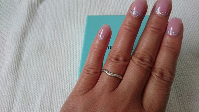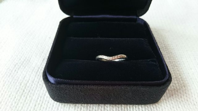 よくある一般的な結婚指輪に比べて細めなので、指にはめた時に違和感がなく、それでいて9つのダイヤと中央部分がカーブしているのがポイントになっていて、お洒落だけど日常使いができる指輪でとても良いです。そして、重ね付けできる同じタイプの1粒付ダイヤリングをスウィートテンダイヤモンドとして旦那様におねだりして重ね付けしたら10年後の楽しみとしてさらに幸せ度アップです。