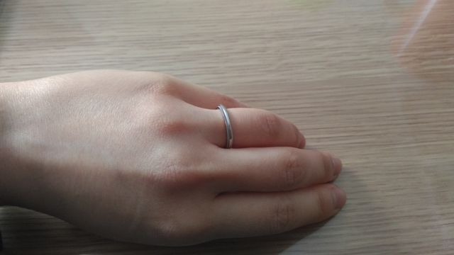私も夫も指が細いので、あまりゴツゴツしたものにしない方が良いねという話をしていました。シンプルなものにしようとしていたのですが、つけ心地がすごく良かったのと、指を華奢に見せてくれるデザインに一目惚れして即購入しました!