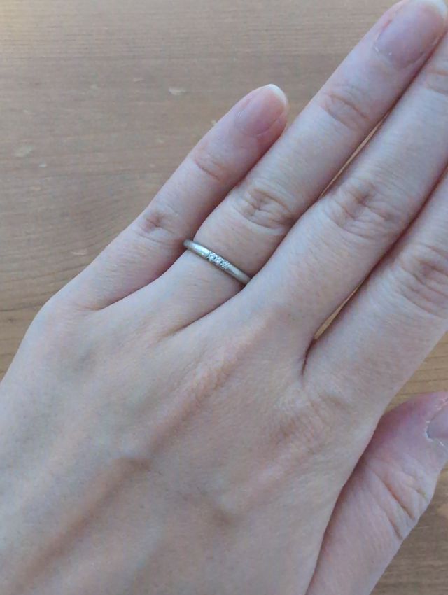 他の指輪に比べて細身でスッキリしたデザインのため、指も心なしかすらっと細く見えます。ダイヤモンドが小ぶりで控えめながらキラッと輝いて、心地よいです。日常生活でつけっぱなしでも邪魔にならず使い心地もいいです。