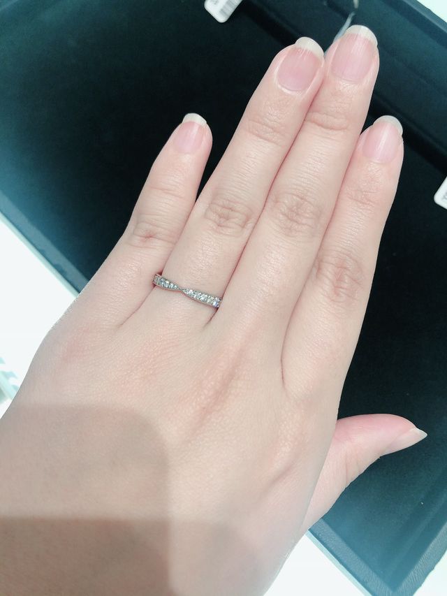 ダイヤモンドを使用した上品なデザインで、他のアイテムの邪魔をしない点が良かったです。また素材もプラチナでつけ心地も良く、つけた時に手が綺麗に見えるデザインでした。ダイヤモンドの輝きも素敵で、綺麗でした。