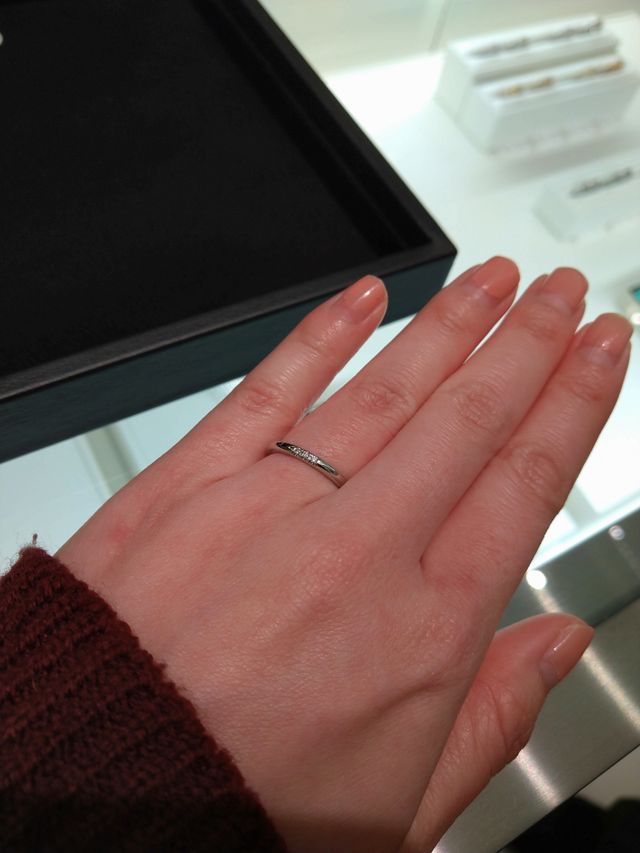 ティファニーは昔から憧れのブランドです。ミル打ちのシンプルなデザインからキラキラのエタニティまで、いろんな種類の指輪がありました。一通り見て試着すれば自分に似合う指輪の形や幅などがわかると思います。