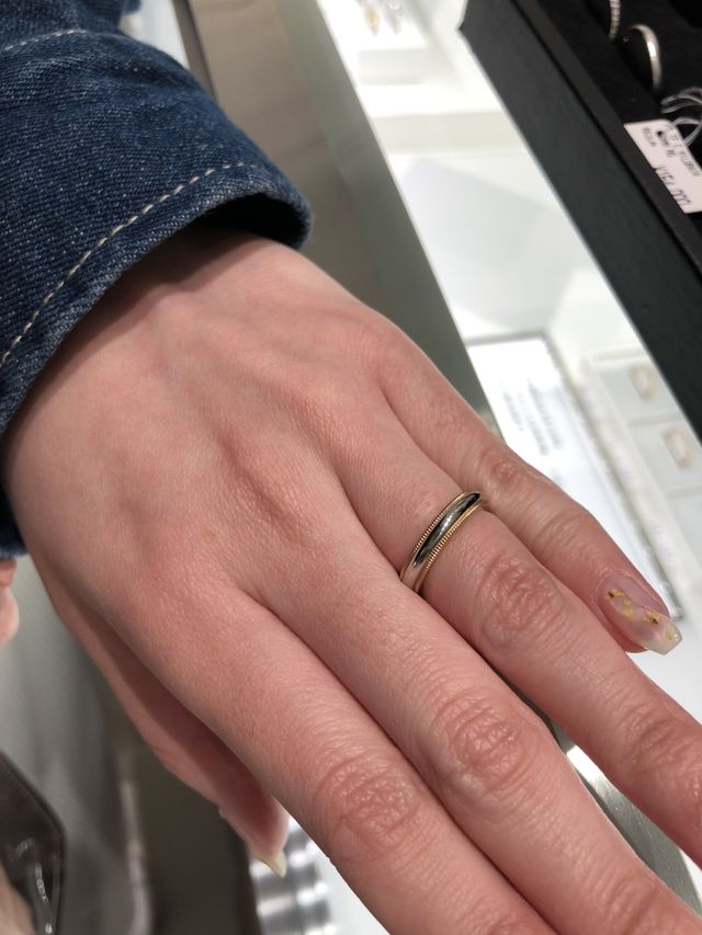 定番のミル打ちのデザインでピンクゴールドとシルバーのデザイン。