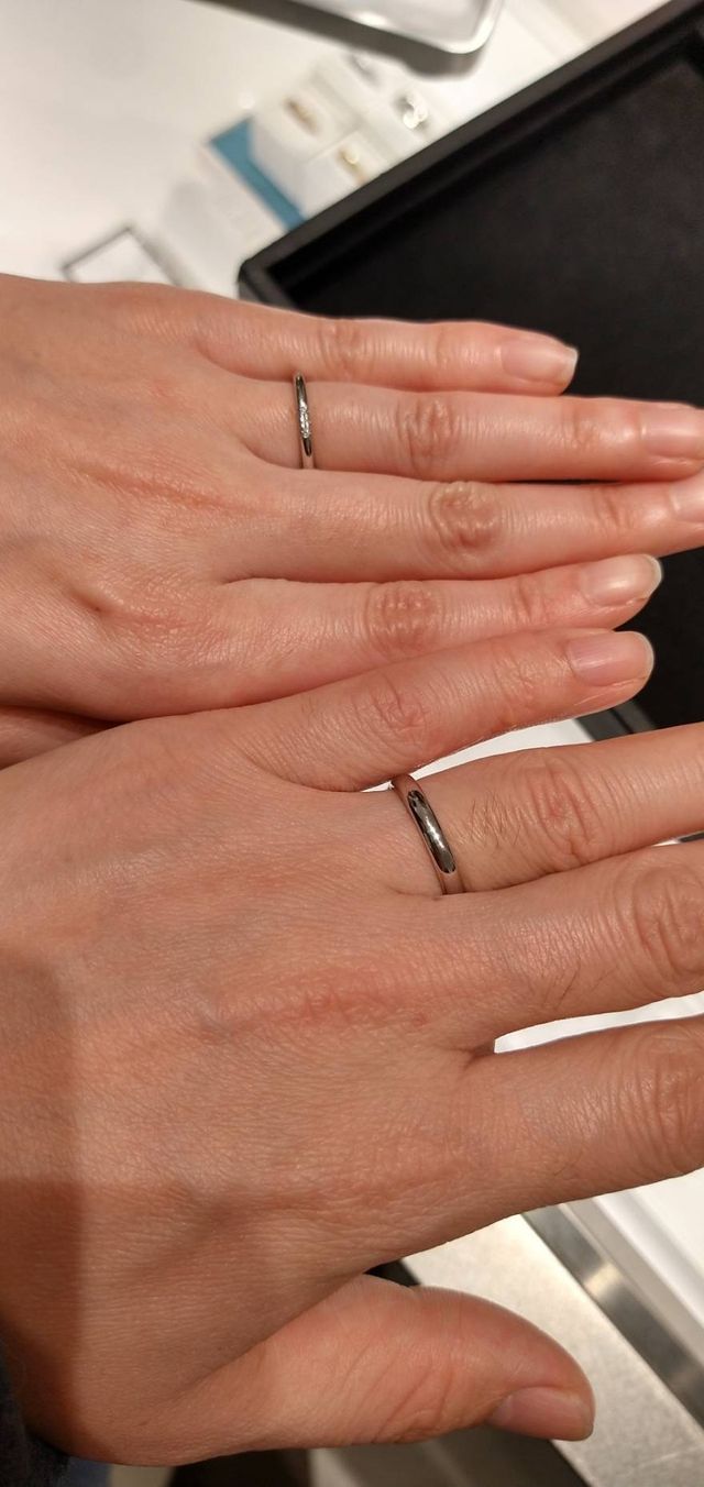 シンプルでありながら高級感があると思います。飾らない形なので、さまざまなリングとの付け合わせの相性も良いと思いました。付け心地も良く、スッと指にはまる感じが良かったです。華奢なリングの幅も女性らしくて絶妙です。