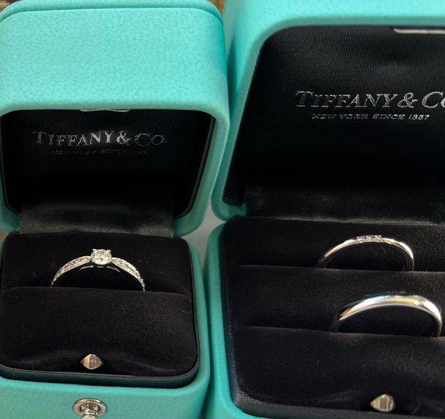 婚約指輪はティファニー。その前にもティファニーのネックレスを渡していたので、結婚指輪はティファニーで決めていました。シンプルだけど、すこしデザインがあるものを探していました。つけ心地もとても良くシンプルなので、他の指輪や婚約指輪との重ね付けも気に入っています。