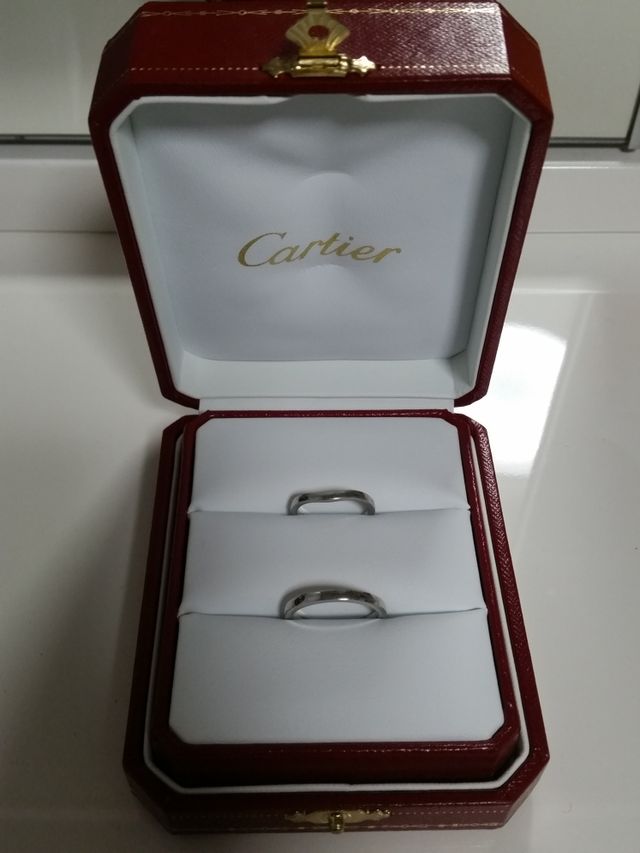 石付きのものとも迷いましたが、石が取れたり傷付いたりするのは嫌だったので、何も付いていないシンプルなデザインのものにしました。女性用はカーブを描いており、指を長く綺麗に見せてくれるので気に入っています。カーブの逆側には小さくCartierという刻印が入っており、そちらを見せるようにして嵌めても良いです。
