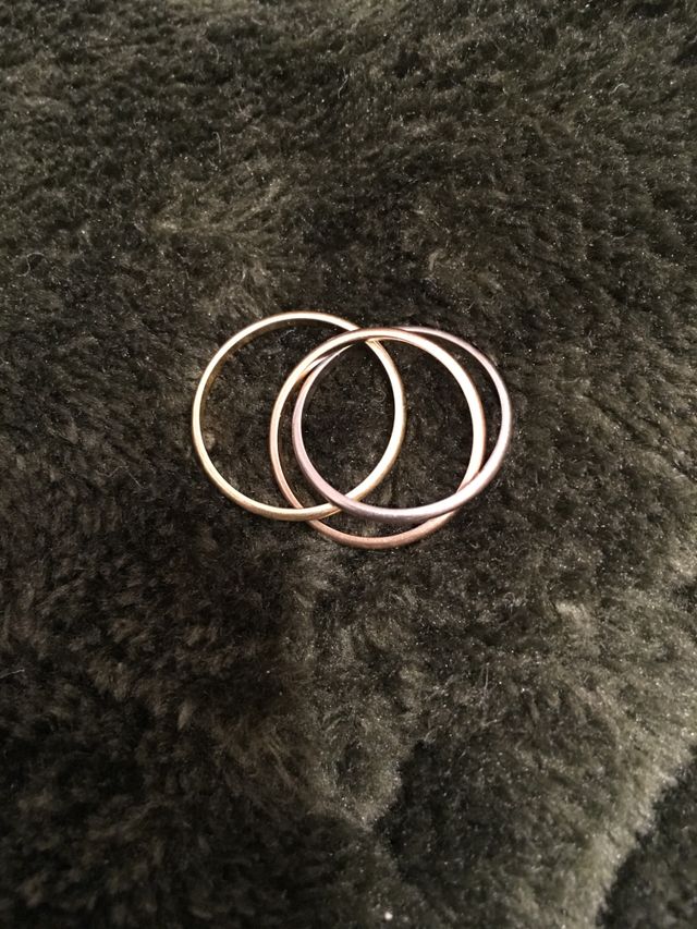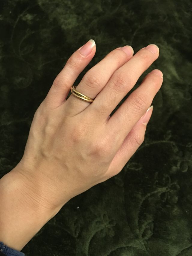 もちろんブランド名も大事だったのでお互い知っているカルティエから見ました。お店に入るとありきたりな結婚指輪ばかりだったので普通のシルバーリングにしようと妥協ムードのところ、違うショーケースを見るとこのデザインに目がいきました。主人も同じくあまりない3連の指輪が気に入り即購入しました。