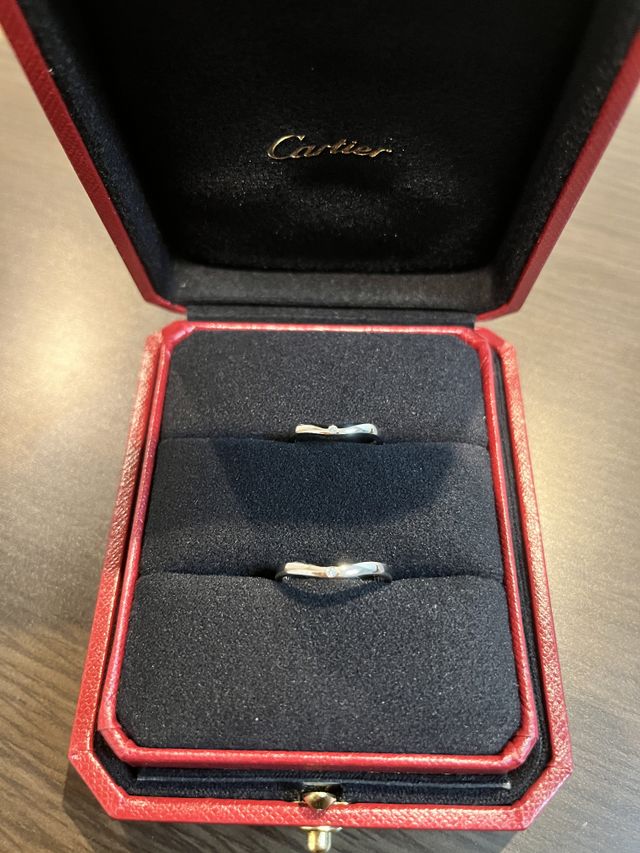 婚約指輪と同じシリーズにしました。日常的につけるのでどんなシーンでも馴染むようにということを考え、またセット付けした際の色の組み合わせを楽しむという意味でも、プラチナにしました。緩いカーブのデザインと、裏面にもCartierという刻印&ダイヤ2粒が入っていて、リバーシブルに付けられるところがお気に入りです。