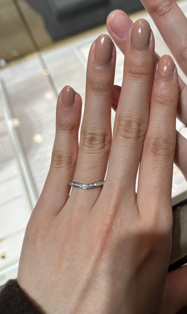 緩くカーブかかっていてとても綺麗なラインで、細めの幅の指輪であるのも繊細でとても良かったです。指を綺麗に見せてくれるデザインだと感じました。ダイヤモンドがたくさん埋め込まれていて、とても存在感がある指輪です。