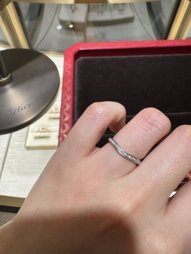 緩いカーブになっているので、指が綺麗に見えます。婚約指輪と合わせた際も馴染みやすいデザインです。インターネットで事前に見ていたのですが、実際に試着してみると思っていたよりも幅が細いと感じました。重厚感はなく、軽いので長時間着けていても気にならないと思います。