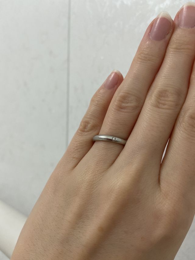 結婚指輪なので、シンプルで長くつけられる飽きのこないデザインにしました。きらきらが好きなためわたしは一つダイヤモンドを入れてもらいました。婚約指輪と重ねてつけても、お互いが引き立ち合いとても素敵です。