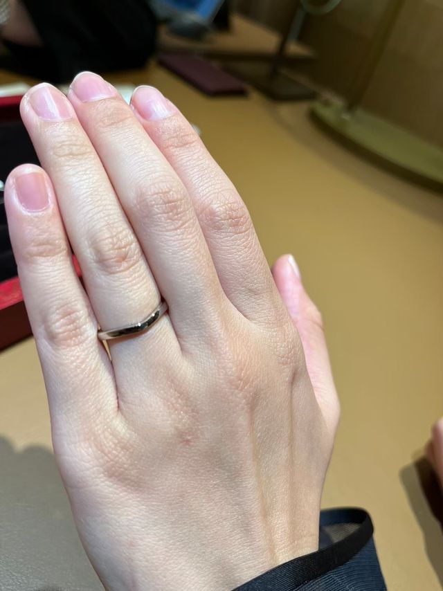 ダイヤがついたデザインを他のブランドで見ていましたが、こちらで定番のリング(ダイヤなし)を試着させていただき高揚感がありました。リングの幅も自分の手に合ったものを選べます。シンプルで飽きがこないデザインです。