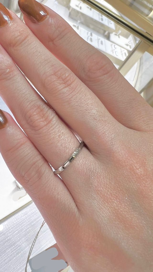 シンプルながらも少しデザインのあるものが気に入り試着しました。写真で見ていたよりも華奢で女性らしく見えるデザインでした。自分の好みがわからない段階で見ていたため少し物足りなく感じたため選びませんでしたが、シンプルな指輪を求めている方にはおすすめです。