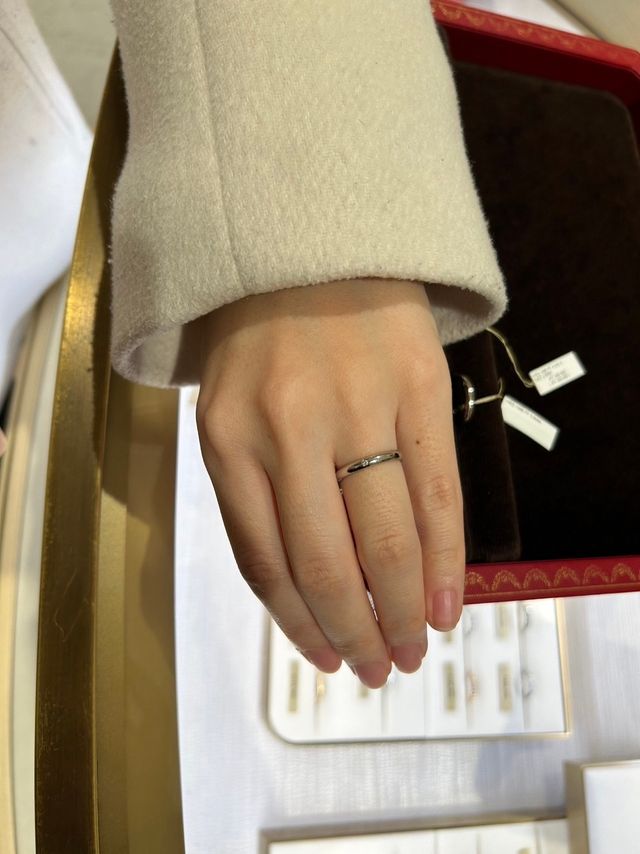 カルティエは王道なイメージで、ちょっとありきたりな感じがしており、そこまで有力候補だとは思っていませんでした。でも、着用してみると、王道である理由がわかりました、、、つけ心地もプラチナの輝きも素晴らしかったです。