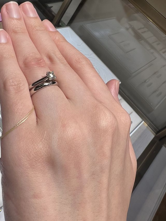 ダイヤモンドが中心に1つ存在感のあるThe婚約指輪というシンプルなデザインに惹かれこちらの指輪を試着しました。