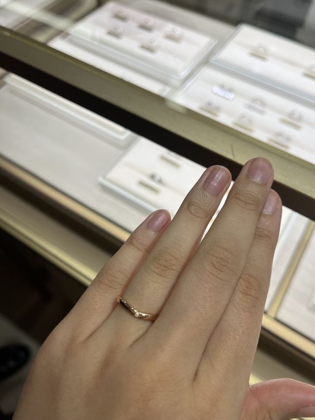 シンプルながらも曲線がかわいい指輪でした。似たような指輪も見ていたのですが、この指輪のカーブ感が指にフィットしてお気に入りです。色も可愛くてそこも選んだ理由の一つです。バレリーナシリーズの婚約指輪と重ね付けできるのもかわいいです。