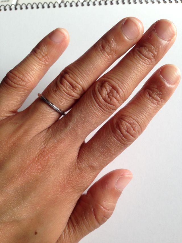 着け心地は指輪をしていないぐらい軽く、洗顔の時や家事の時に引っ掛かりはないです。ただ着けていると絶対傷は付くので、研磨などをしてもらう際に薄くて大丈夫かな?と言う不安はあります。