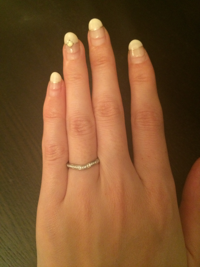 私はどうしても婚約指輪と重ね付けがしたかったので、重ね付けありきのデザインにしました。ちょうどこの結婚指輪は婚約指輪のダイヤが邪魔にならないようにへこんでいて、2つつけた時にスマートです。また「バレリーナ」という名前もおしゃれで独特だったので決め手になりました。