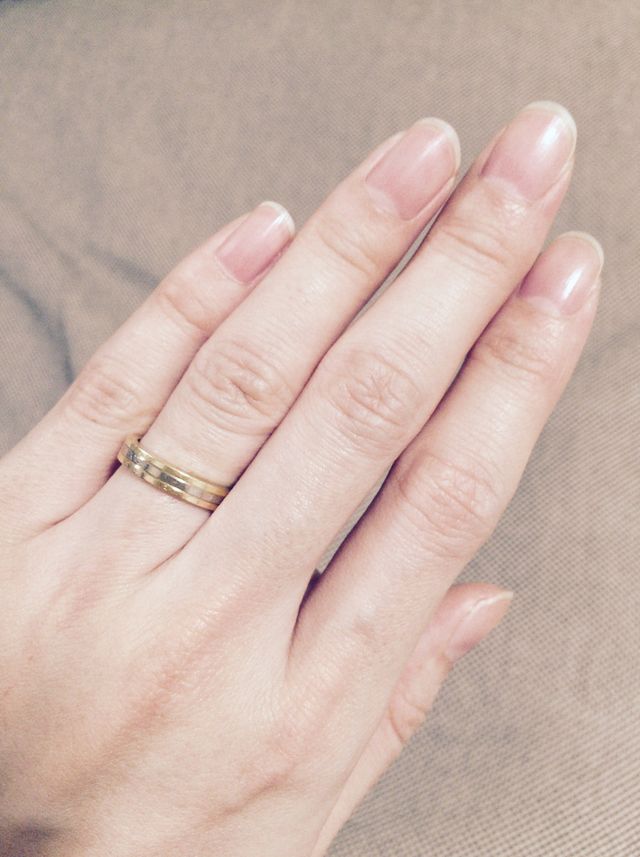 よく見るプラチナのリングではなくて、普段身につけるアクセサリーと同じゴールド系で探していました。そこで見つけたこのスリーゴールドのリング。結婚指輪っぽくないところも決め手となり、迷うことなく購入しました?
