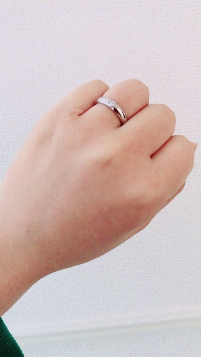 自分の指が太くて短いので、華奢なデザインより太めの指輪の方がはめてみてしっくりきた。シンプルなものが良かったので、初めは何もついていないものにしようと思っていたが、石がついている方をオススメされて、付けてみて可愛かったので、この指輪にした。
