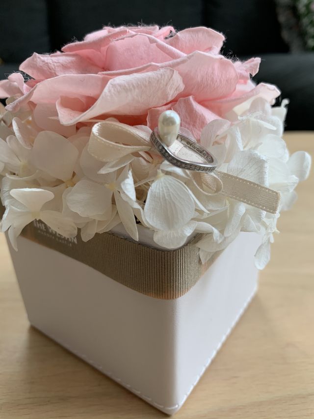 結婚指輪は毎日身につけるものなので、シンプルで飽きのこないデザインで、尚且つ女性らしさも兼ね備えた指輪がいいなと思っていました。夫の指輪は同じコレクションのダイヤなしなので夫婦で同じデザインなのも決め手です。