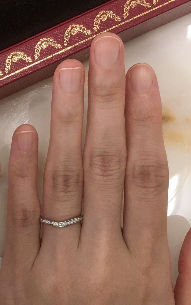 ウェーブがかったデザインは元々はあまり候補にしていませんでしたが、こちらの指輪は可愛らしすぎず、洗練されたデザインで、かつ付け心地もとても良く、細くて華奢ですが、ダイヤの輝きが綺麗なところが気に入りました。