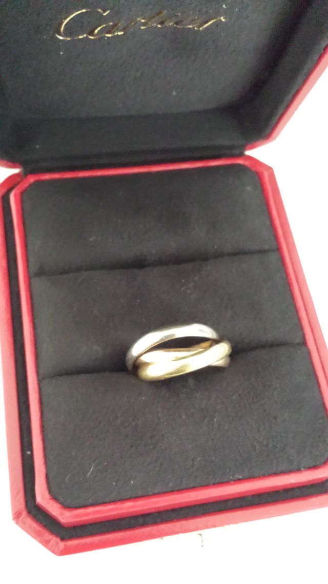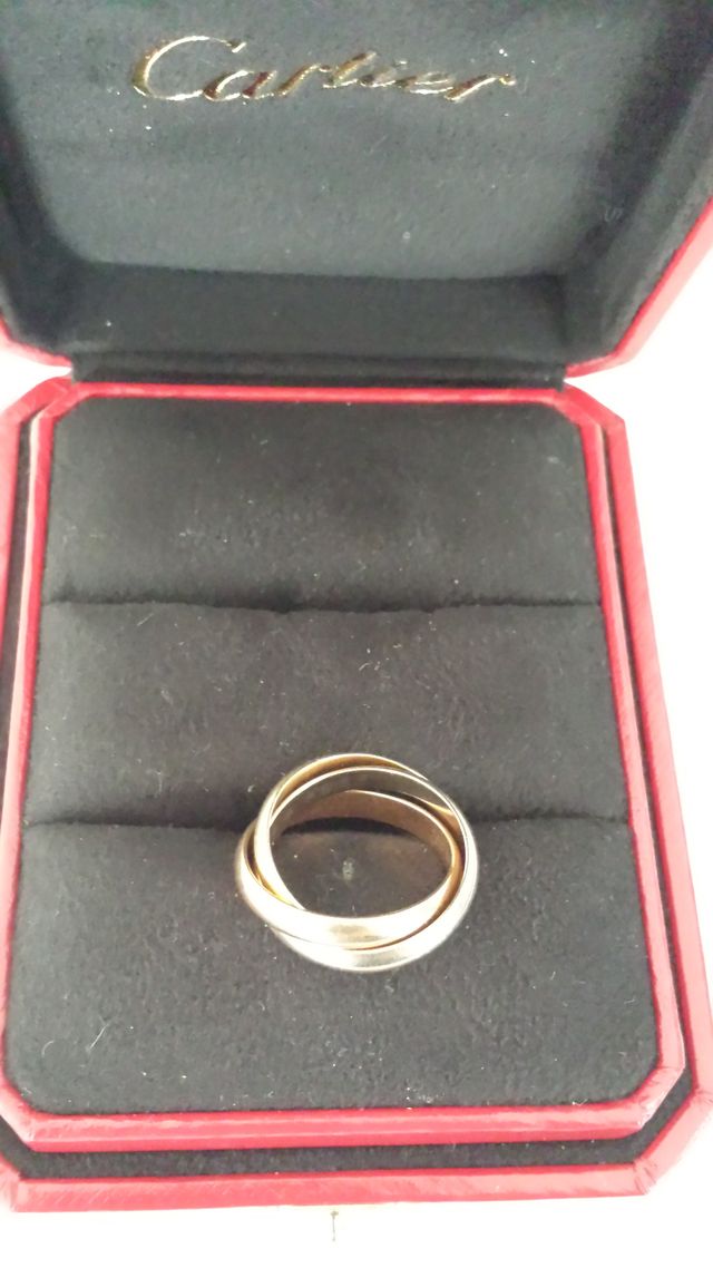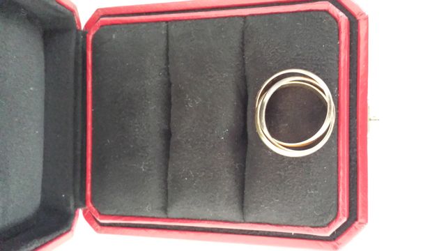 他に指輪や時計などのアクセサリーをつける趣味ではないので結婚指輪1つでゴージャスに見えるもと思い三連リングにしました。とても存在感あります。シングルに比べると重量もありますが12万ほどで購入しました。カルティエブランドですが安い料金だと思います。3連なのでつける際は手のひらなどにいったんおいてリングの重なる順番を正さないと輪がきれいな円にならないです。きれいな円でない状態ではめるとサイズダウンしてしまい指から抜けなくなってしまいます。長い期間つけるものですので関節も太くなってしまったり、習い事などで外さないといけないこともあり(茶道など)、ぴったりサイズを購入すると今後のサイズの引き延ばしの際に技術料がシングルよりも3倍かかってしまいます。私はこのリングを大きいサイズで購入し最後の画像のようにきれいな円にせずわざと重ね合わせを変えてリングの内径の調整を行って着用しています。内径の調整ができることも指輪の決め手になりました。