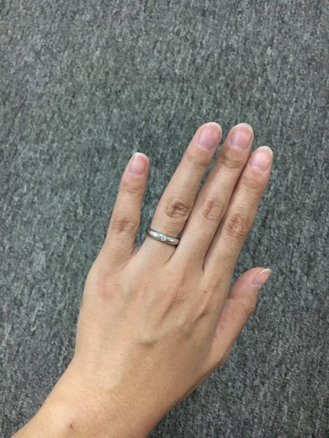 日常的に付けていても違和感のないシンプルなデザインかつダイヤの存在感です。シンプルなデザインなのですが、全体的に丸みを帯びたリングというのが意外となく、一番この形が綺麗だなと思いました。少し分厚いのも個性があって良いと思いましたし、この太さについているダイヤの大きさが、一番キラキラしていているように見えました。