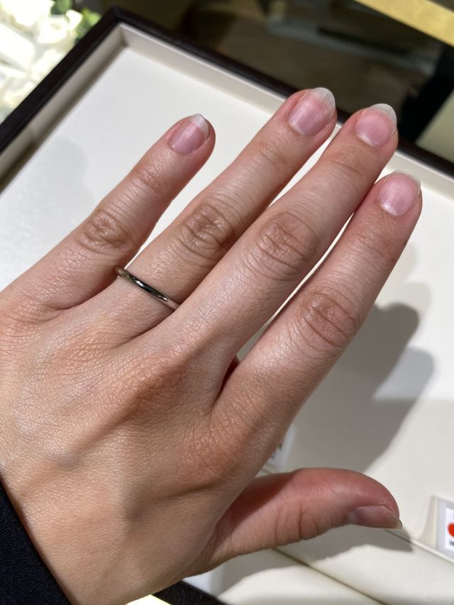 リングの断面が円に近いリングでした。とても細かったので、短めの指にフィットしないように感じました。華奢な指の方に似合うかと思います。細くても光沢があり存在感があります。同じシリーズでリング幅のレパートリーが多かったので、気に入るものはありそうでしたが、やはりカルティエ価格でした。