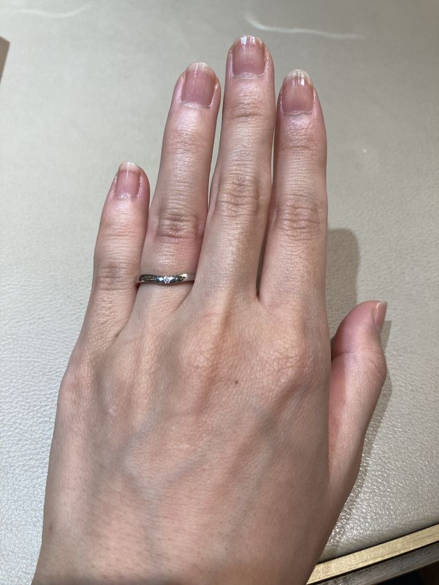 かなりシンプルなデザインでした。指が短く、水かきもかなりあるゆびだったので、ストレートだと傾きがきになったので、ウェーブのデザインを試着しました。シンプルな指輪をお探しの方にはおすすめなデザインだと思います。