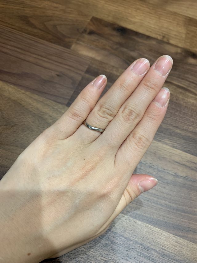 少しウェーブした形がとても可愛く気に入りました。ダイアが3つ付いており、どちらを見える側(手の甲側)にしても良いのでそれも気に入りました。他にも良いなと思ったデザインはありましたが、価格が高かったため断念しました。