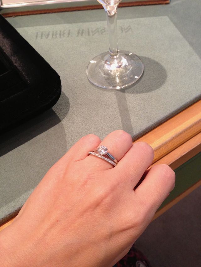 婚約指輪のダイヤモンドリングと重ね付けしようと、ハリーウィンストンのベル バイ ハリーウィンストン バンドリングを試着しました。婚約指輪を買った時にお店の人に重ね付けにお勧めされたものです。色々な幅のものがあるので、重ね付けする場合は実際に試着してバランスの良いものを選ぶと良いと思います。