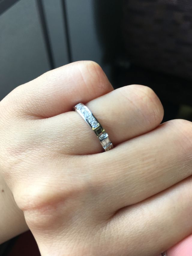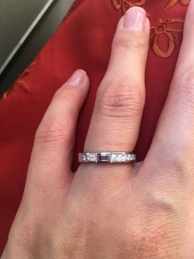 ダイヤモンドの美しさと、他にはないデザインが決め手でした。華奢なデザインではなく、存在感がある太めな指輪を探していたので、私の理想にぴったりでした。かなりキラキラしていますが、ハーフエタニティなので、急な弔事等ではくるっと回してプラチナ部分だけで使えることも魅力でした。